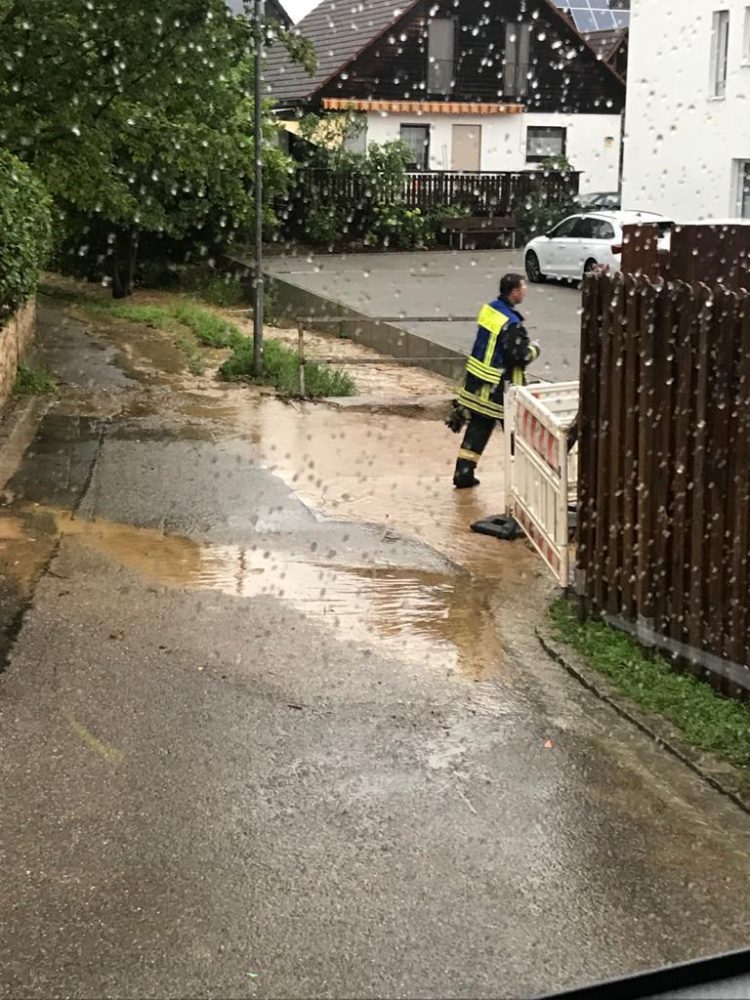 Durch den heutigen Starkregen hatten wir sechs Einsatzstellen abzuarbeiten. Darunter zwei Mal Wasser im Keller und zwei Mal überflutete Fahrbahn. Nach rund drei Stunden waren alle Einsatzstellen abgearbeitet.